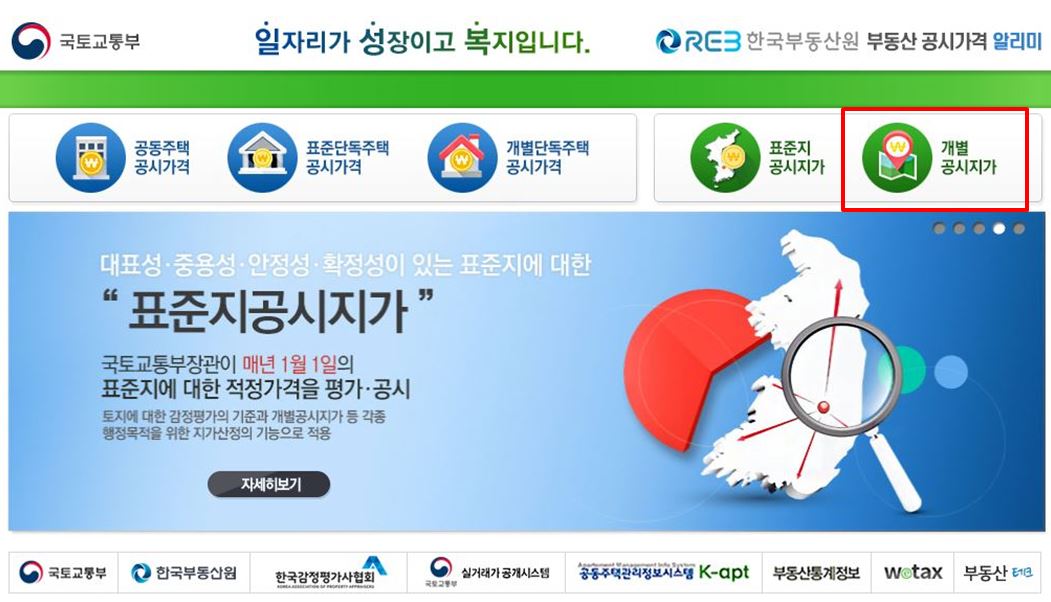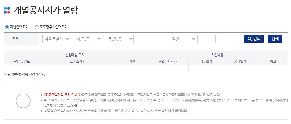 부동산공시가격 알리미를 통해 표준지 공시지가와 개별 공시지가 조회를 할 수 있습니다.