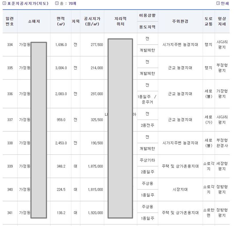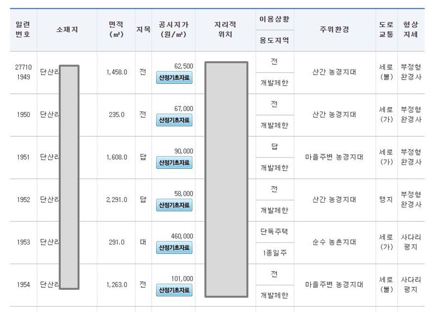 원하는 곳의 주소를 입력하면 다양한 검색결과를 확인하실 수 있습니다. 일련번호, 소재지, 면적(㎡), 지목, 표준지 공시지가(원/㎡), 지리적위치, 이용상황, 용도지역, 주위환경, 도로교통, 형상지세 정보가 나와 있습니다.